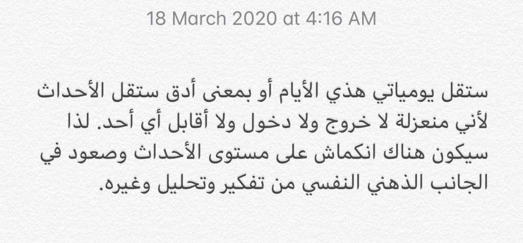 كنت في بداية نومي، غفوت لدقائق ثم استيقظت بشكل مفاجئ وكتبت الملاحظة أعلاه. فلسفة ما قبل النوم بكلام لا أدري كيف وجد “انكماش على مستوى الأحداث وصعود في الجانب الذهني النفسي” 😹 في المقابل أتفق مع ما كتبته، أيامي الآن هادئة جدًا وهذا ما سيظهر في يومياتي، أيامي خالية من الأماكن والأشخاص والأحداث. لم يتبقى لي سوى القليل مما يحدث وأنا في البيت.
