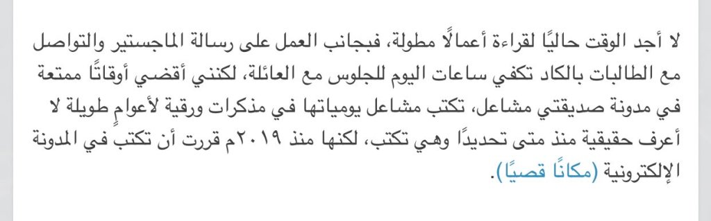 اليوم كان رابع وآخر اختبار عن بعد كبديل لاختبارات منتصف الفصل، لم أكن مطمئنة لوصف الاختبار بالكتاب المفتوح لأني أعلم جيدًا أن هذا يعني صعوبة في مستوى الأسئلة وفعلًا هذا ما كان. الاختبار صعب ومحير جدًا. أتمنى ألا يكون هناك اختبارات نهائية حفاظًا على معدلاتنا.