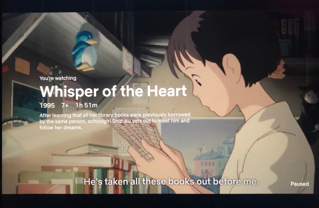 شاهدت Whisper of the Heart قصته جميلة والشخصيات كذلك، ولا يمكنني وصف جمال التفاصيل في المشاهد، بشكل عام جميل ولطيف. صرت أصور مشاهد الكتابة وإذا استمريت بفعل هذا ستكون لدي مكتبة ضخمة.