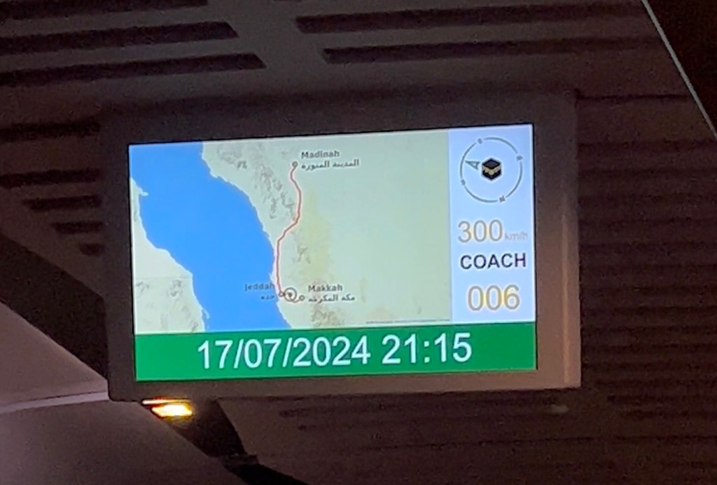 أنا اعتدت استغراق ساعة في سيارتي بين جدة ومكة، الآن أصل في غضون ٢٠ دقيقة! إذًا أربعون دقيقة حُفظت من يومي، تجربة تستحق. المضحك في رحلة الذهاب لم أنتبه لوجود شاشة توضح أين وصلنا في مسار رحلتنا والأهم سرعة القطار، وهنا جن جنون فضولي أريد معرفة (السرعة اللحظية) للقطار، حاولت تحميل تطبيق ولم ينجح وعدت أحسبها ذهنيًا بعد وصولي بقانون السرعة المتوسطة، في رحلة العودة ارتوى فضولي إذ شاهدت الشاشة وراقبت الأرقام وهي ترتفع حتى وصلت إلى أقصى سرعة 300km/h.